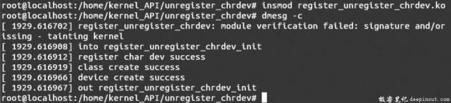首先编译模块,执行命令insmod register_unregister_chrdev.ko插入内核模块,然后输入命令dmesg -c查看模块插入结果,会出现如图A所示的结果。