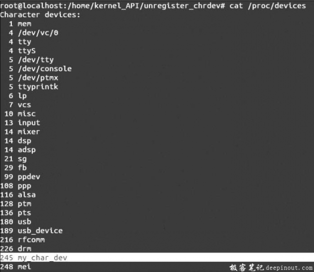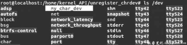 执行命令cat /proc/devices查看注册的字符设备,出现如图B所示的结果。