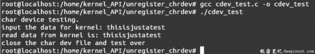 由图A和图B的显示结果可以判断添加字符设备区及字符设备成功;图E和图F的显示信息说明用户程序能够成功的访问新字符设备,并且字符设备能够正常的工作,正好说明了添加的字符设备是成功的,函数register_chrdev()能够向Linux内核系统添加字符设备。执行完命令rmmod register_unregister_chrdev.ko之后,重新查看文件/proc/devices的内容,可以发现没有出现图B的记录表项,说明设备被函数unregister_chrdev()成功删除。