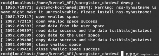用户测试程序执行完之后,输入命令dmesg -c,出现如图F所示的执行结果。