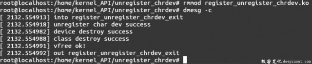 卸载内核模块,执行命令rmmod register_unregister_chrdev.ko,然后输入命令dmesg -c,出现如图G所示的信息。